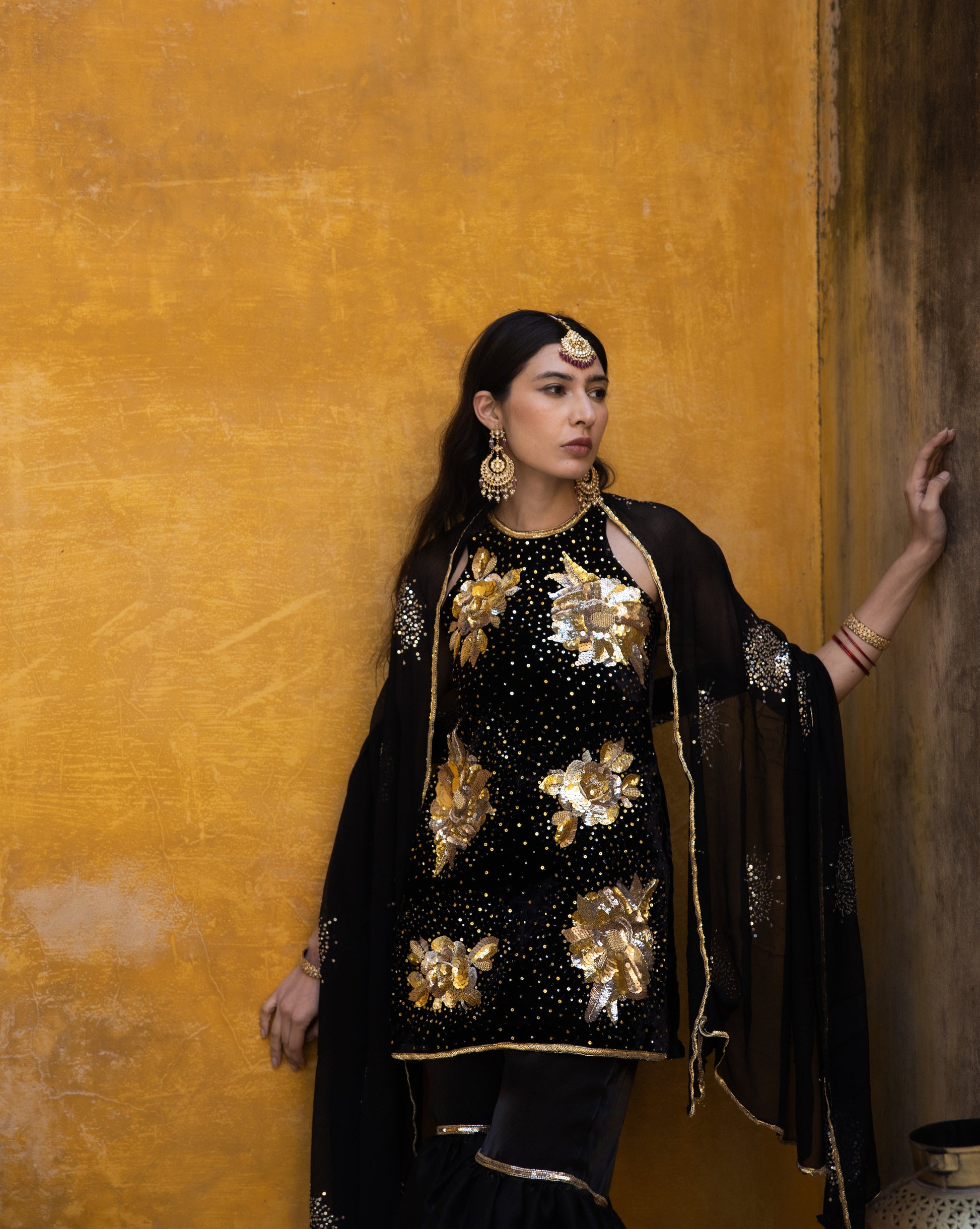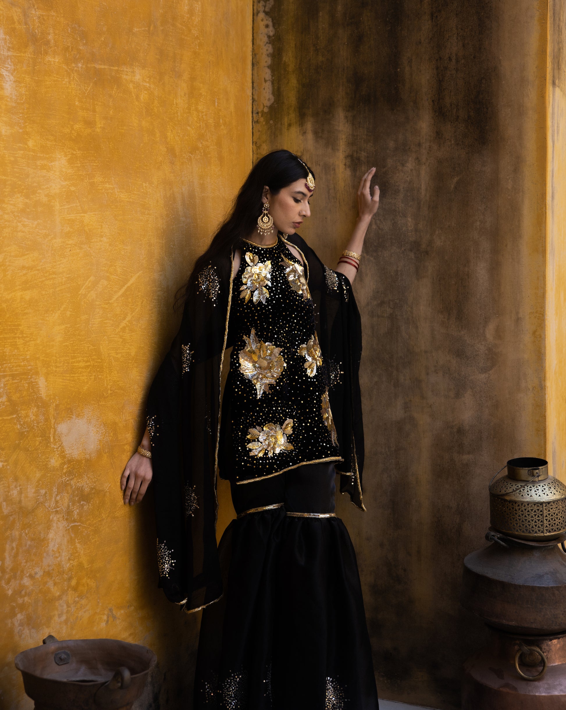 Kurta: This set features a sleeveless short kurta, embellished with a zardozi border along the neckline and hemline. The silhouette is further elevated with hand-embroidered floral motifs, intricately adorned with golden sequins and fine zardozi detailing. Shimmering sequins are scattered throughout.