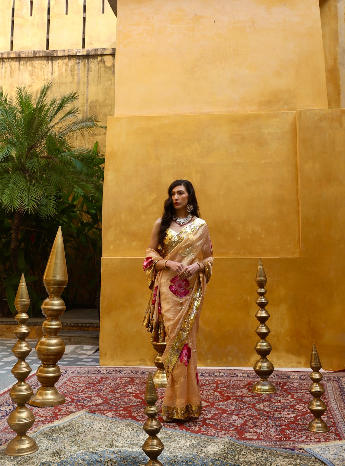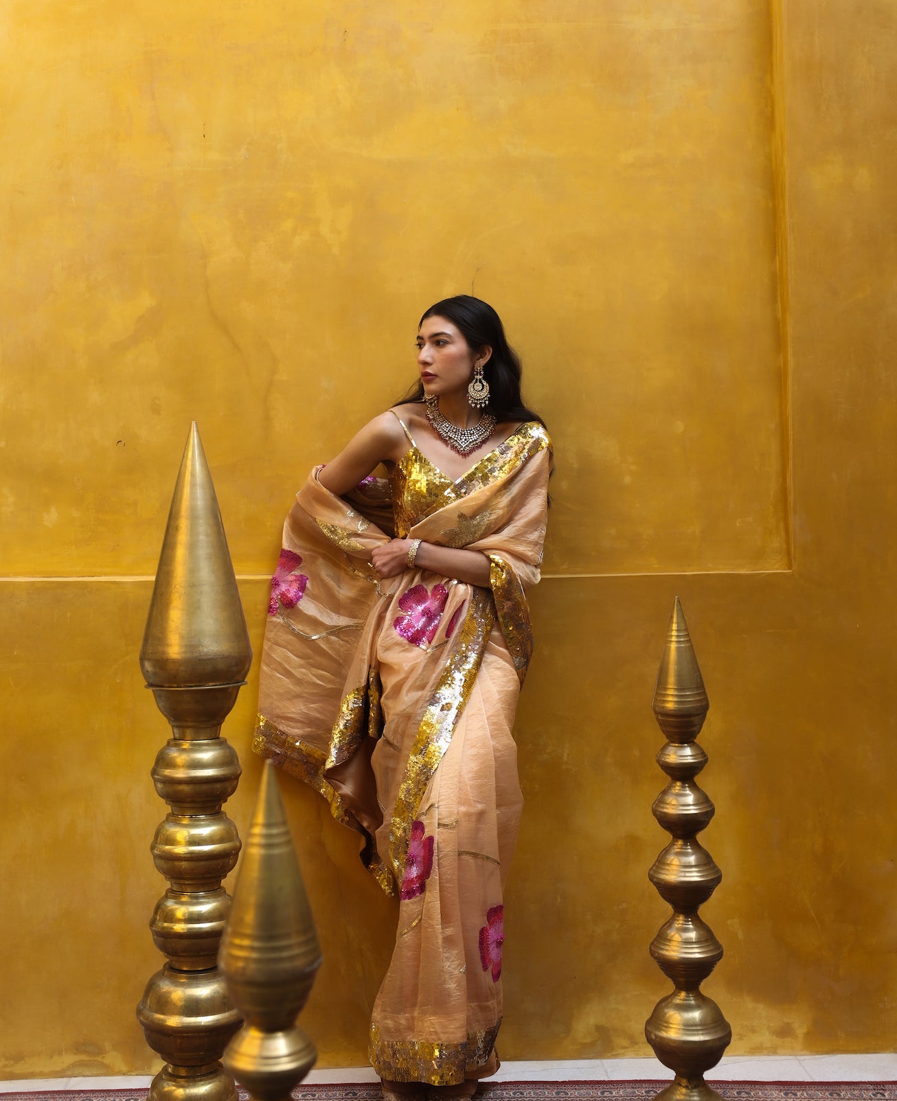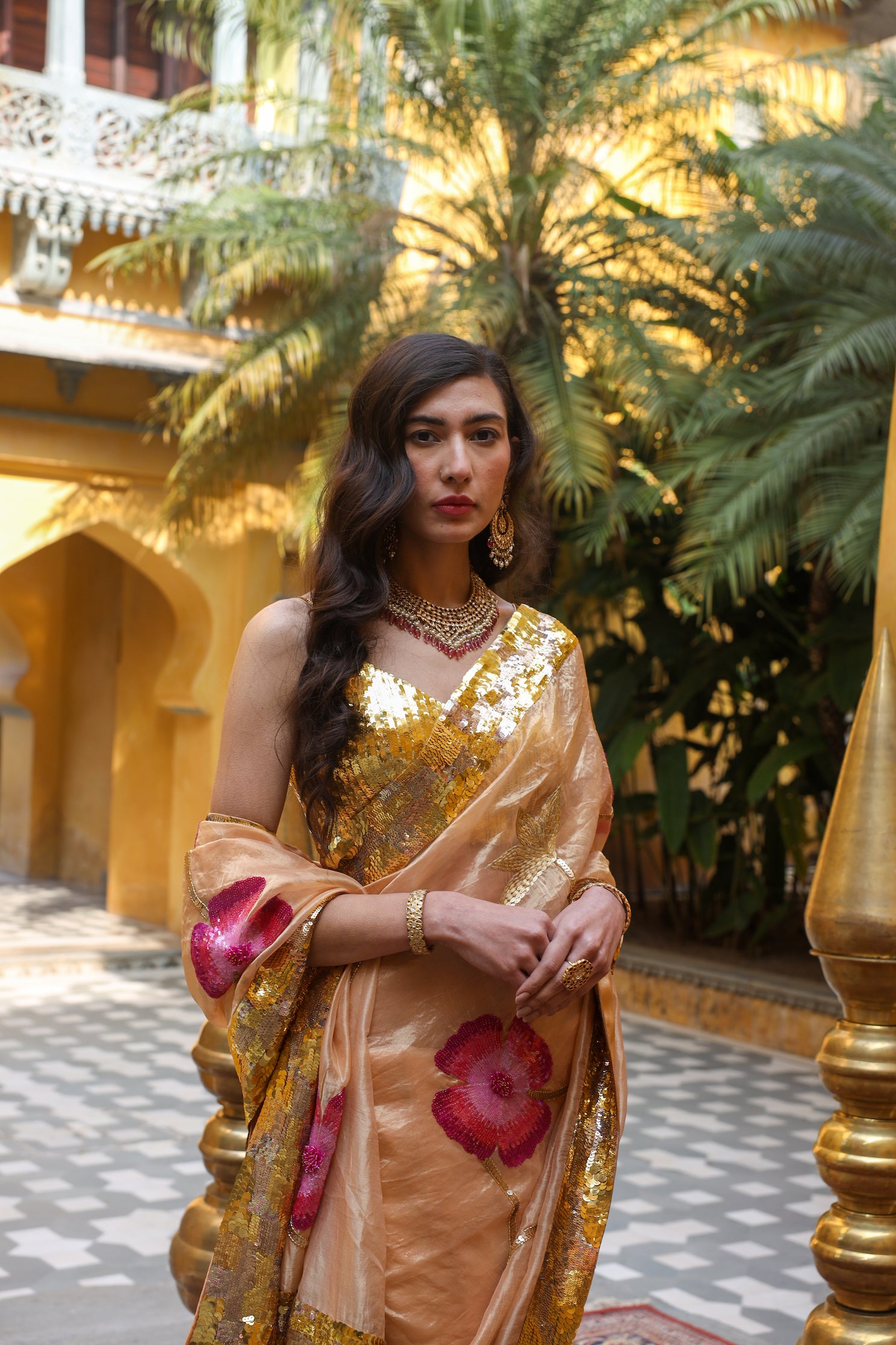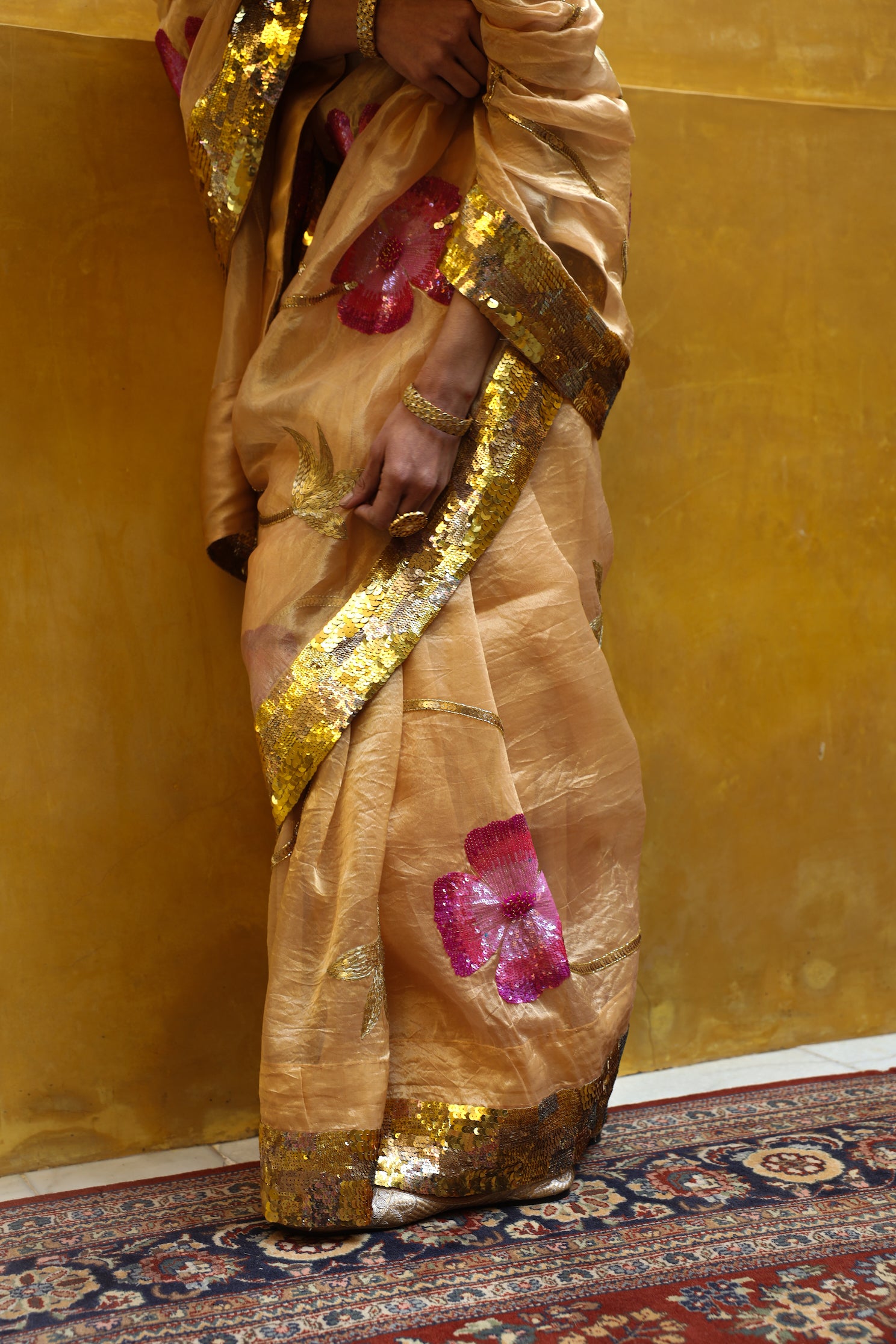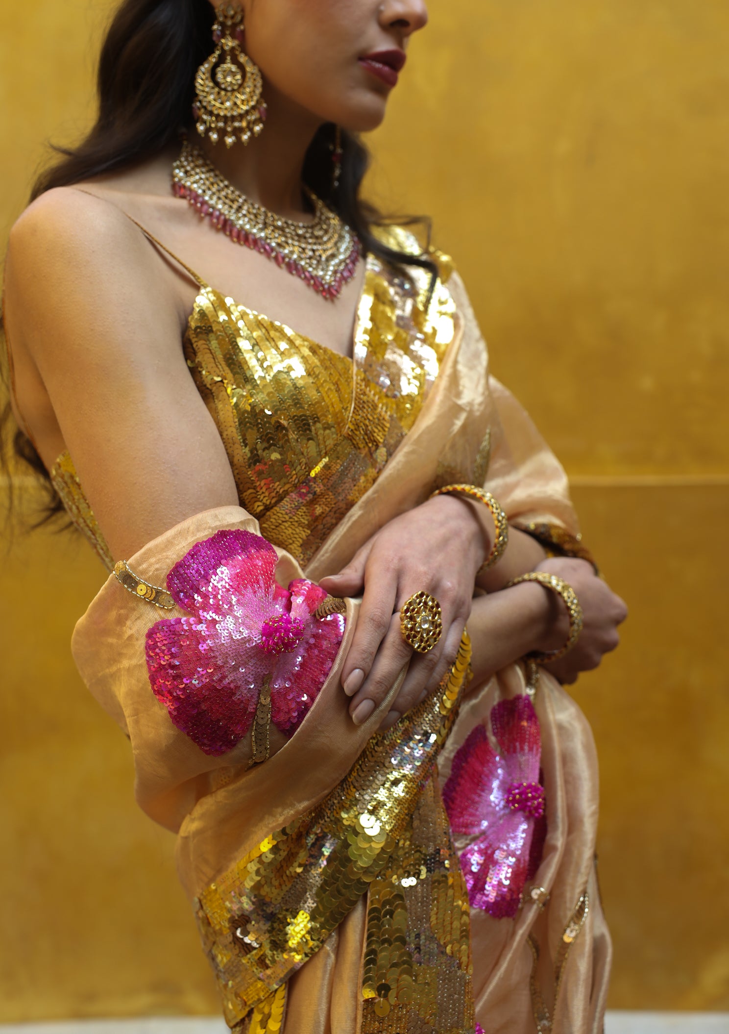 The golden pure tissue saree featuring meticulously hand-embroidered monochromatic pink flowers. Enhanced with colored sequins, intricate 3D cutdana work, a complementary leaf jaal design. Beautifully accentuated by a luxurious golden sequins border. This saree is paired with a golden blouse featuring hand-embellished sequins throughout.