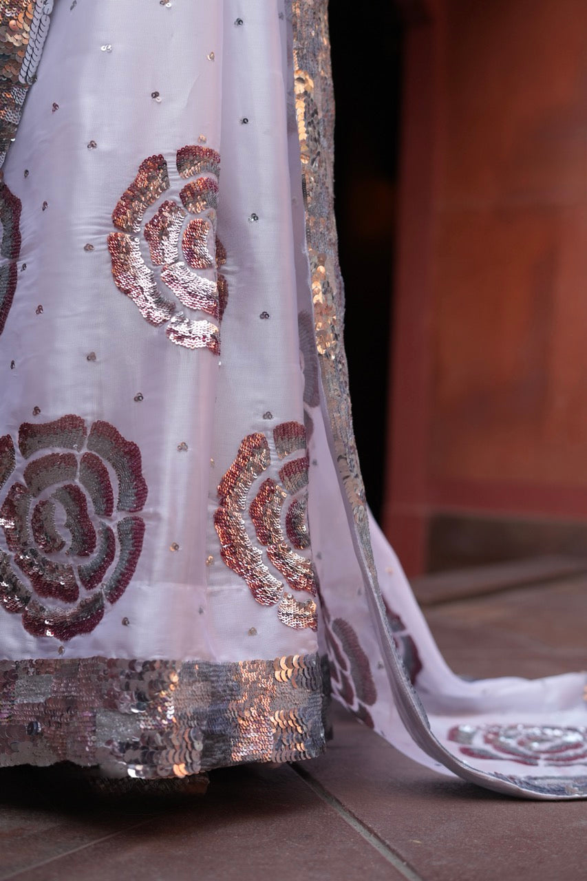 The white organza silk saree features exquisite hand-embroidered floral motifs, beautifully enhanced with silver and iridescent maroon sequins to create delicate blooming roses. The saree’s border is richly detailed with an opulent sequins finish, adding a touch of radiance to the design. Styled with a white blouse featuring shimmering silver sequin rose motifs. This saree is a statement, blending elegance with contemporary charm—perfect for a cocktail affair.