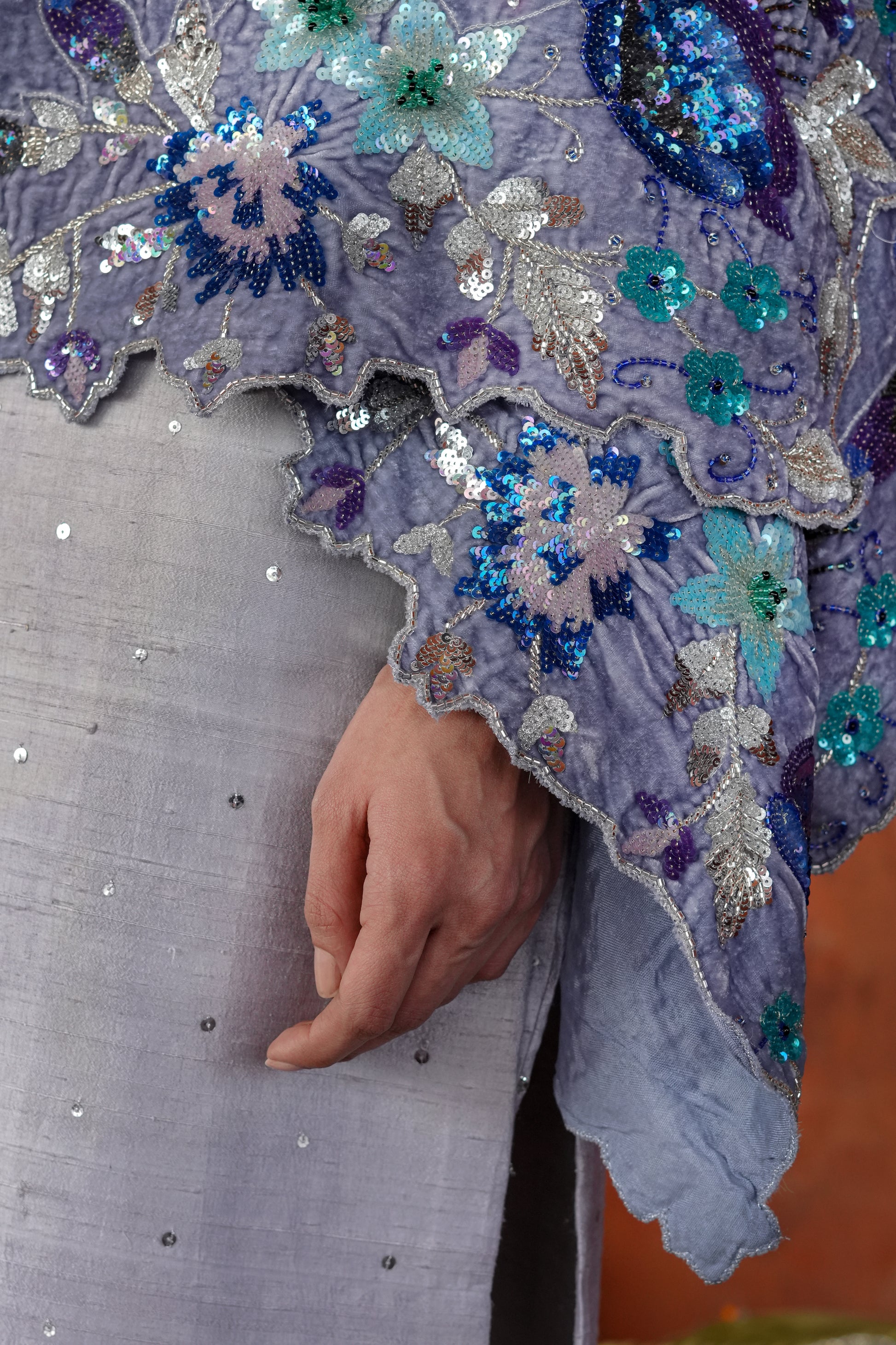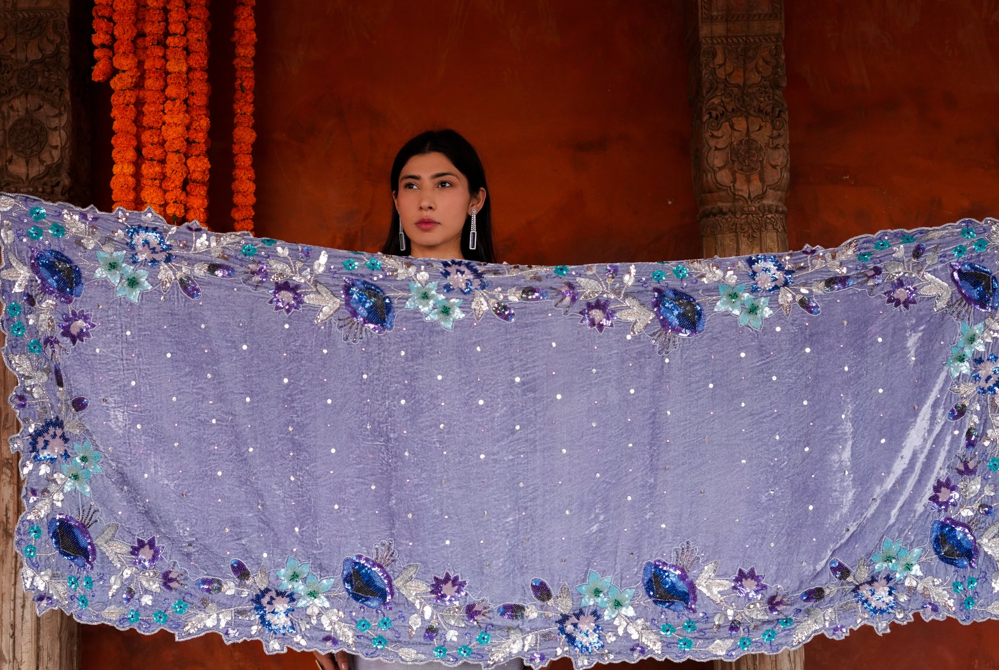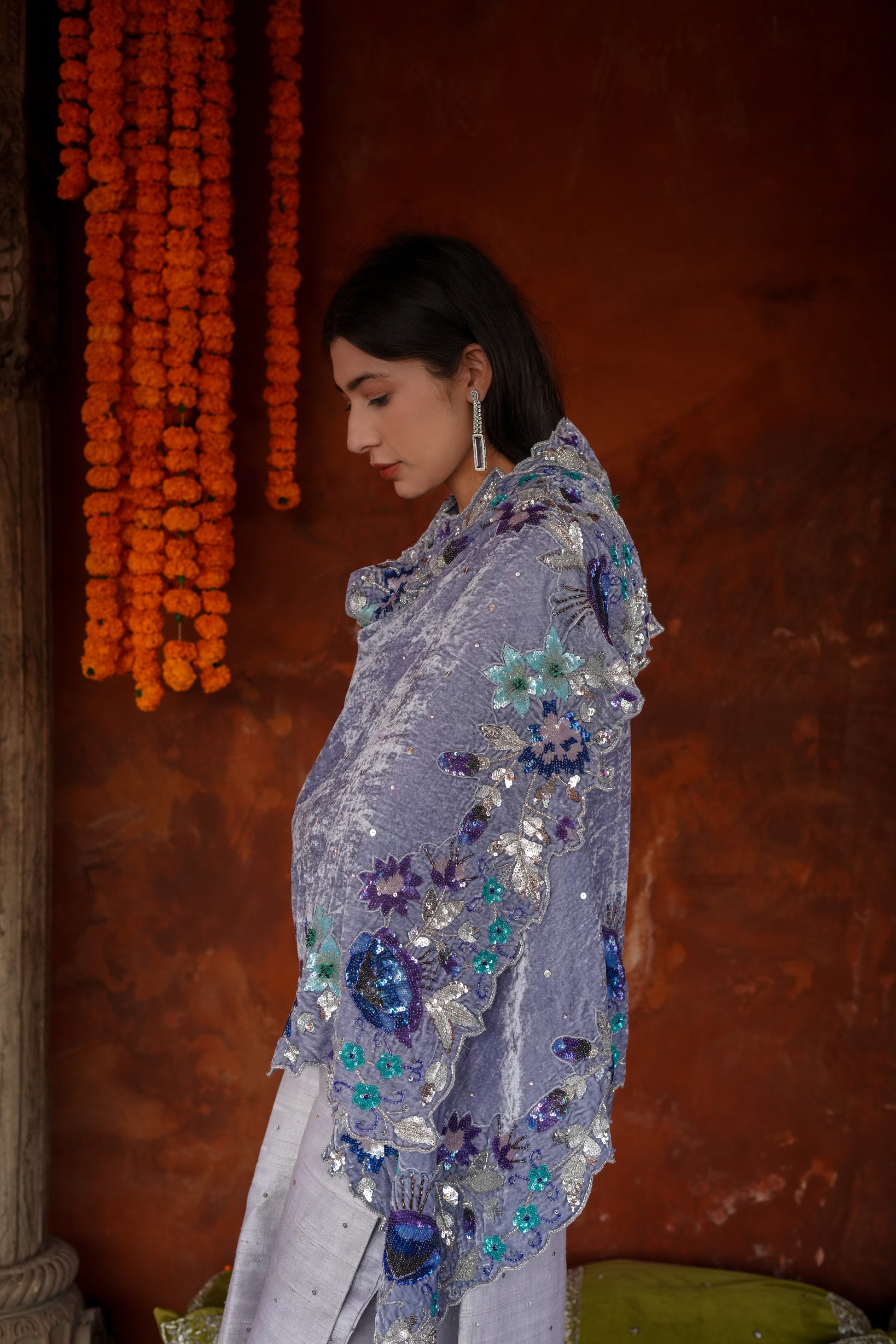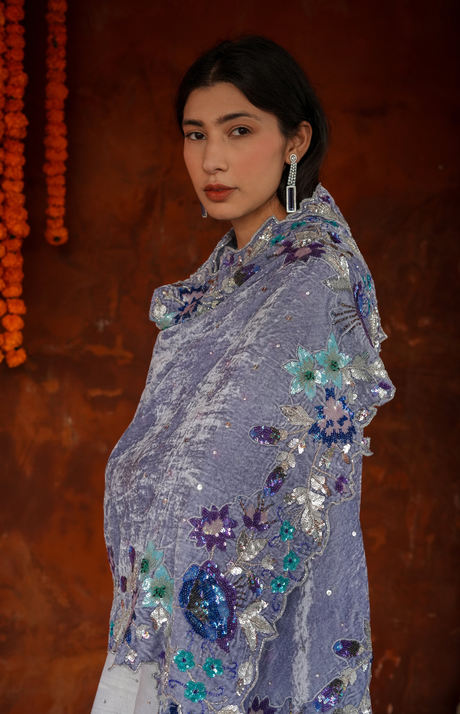 The grey pure velvet shawl is distinguished by its hand-embroidered monochromatic floral border, exquisitely enriched with cutdana work and sequins in shades of blue with subtle hints of silver. The design is further refined by intricate cutwork detailing along the edges.