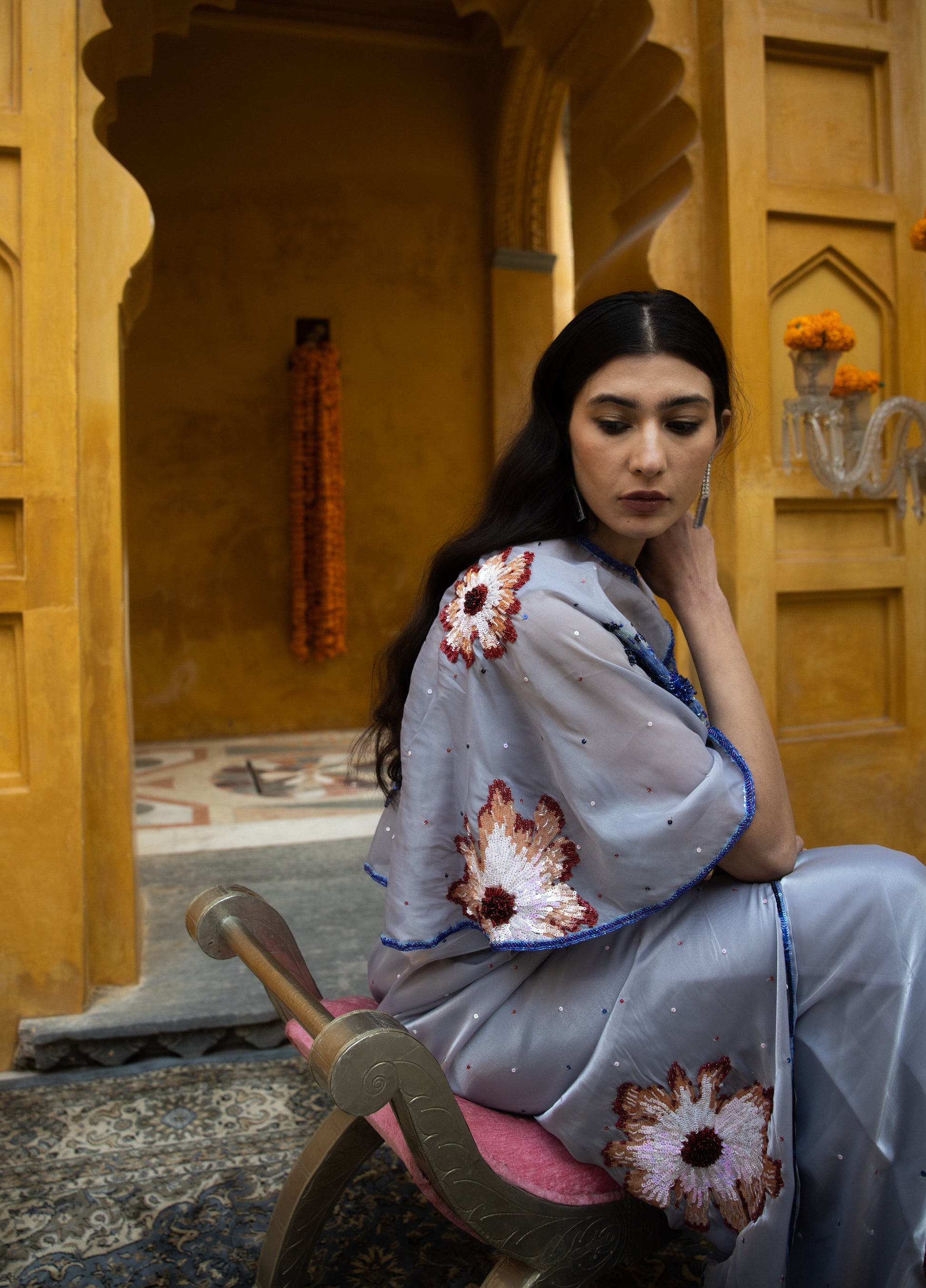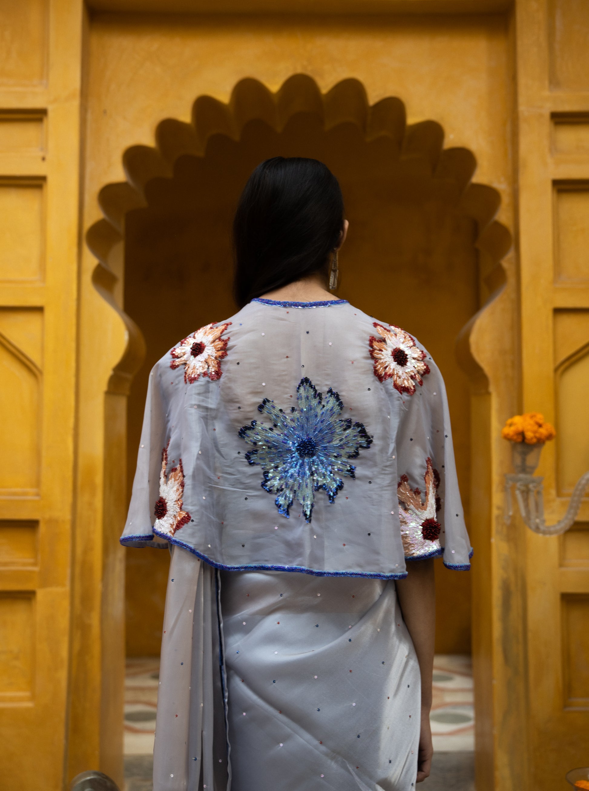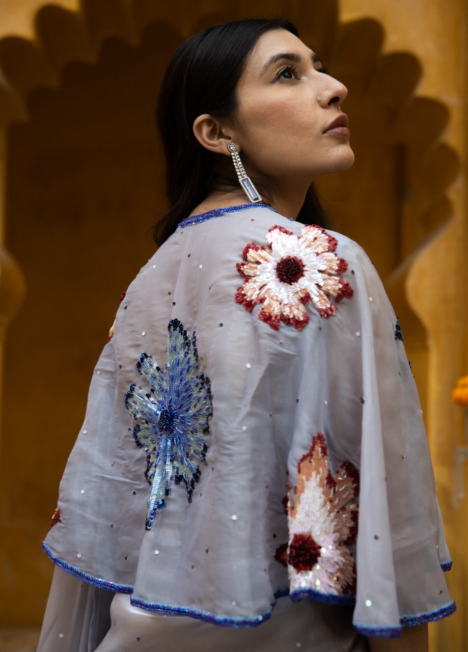 The grey organza silk cape is meticulously hand-crafted featuring blooming flowers. The border is adorned with sequins and cutdana.